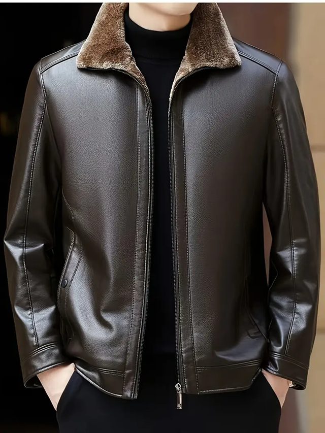 Men’s Stylish Jacket with Faux Fur Trim – Warm Brown Zip-Up Winter Coat for Casual Business Wear, Long Sleeve, Side Pockets, Glossy Finish.