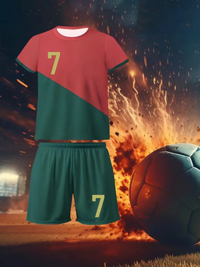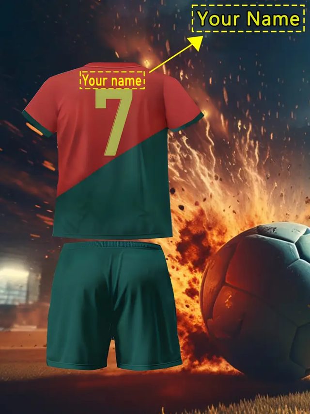 2pcs Boys Soccer Jersey Set, Custom Name #7 Portugal National Team, Quick-Dry Polyester Crew Neck T-Shirt & Shorts, Breathable Loose Fit, All-Season Sports Outfit, for Outdoor
